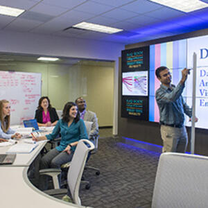 The Data Analytics and Visualization Environment (DAVE) allows you along with our faculty, and staff to explore data and data visualization like never before. This lab provides a modern 1000 square foot space on the second floor of Rike Hall for learning and collaboration. DAVE is equipped with professional hardware and software tools, offering unique opportunities for hands-on analytics experience right in our own building.
